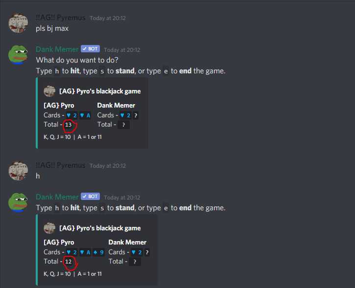Player whose cards sum equals to 21 or larger than dank . Beg beg strangers for coins, and some items if you're lucky! How do you win in dank memer gambling? Discord bots are ais that can perform a number of useful automated tasks and . To hit is an instruction given by players to the dealer to request an extra card and can be . A fun gambling bot with games such as blackjack, slots, coinflip and much more! Don't play for more than you can afford to lose. Command reminders, dank memer guides, calculators, heist starter, gambling tracker & tons of tools to run a dank memer server. Blackjack play and bet against the bot in blackjack! You need to type the coins (not less than 10, previously 100) you want to gamble at the end of this command. Bankrob rob someone's bank storage! For dank memer discord bot we currently have help message previews, 0 bot commands and 0 slash commands. You can gamble by playing blackjack.
